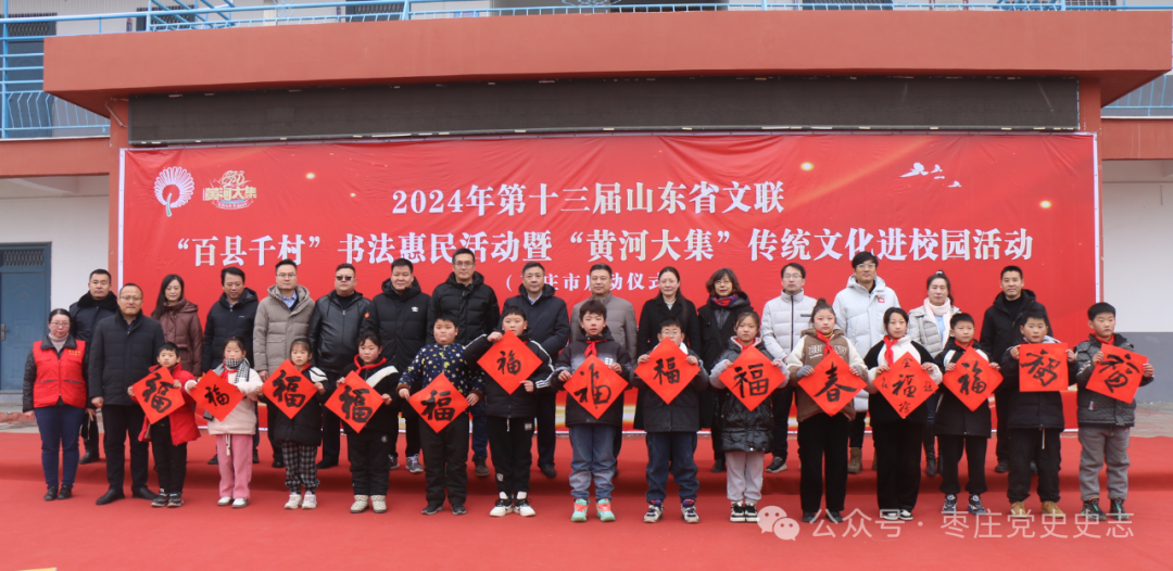 ????在由省文聯(lián)、省書協(xié)共同主辦,市文聯(lián)、市委黨史研究院、市書協(xié)、市民盟書畫院、陶莊鎮(zhèn)政府共同承辦的2024年第十三屆山東省文聯(lián)“百縣千村”書法惠民活動棗莊市啟動儀式暨“黃河大集”傳統(tǒng)文化進(jìn)校園活動上,近20位書法家揮毫潑墨,為奚村、奚仲小學(xué)廣大群眾、在校學(xué)生創(chuàng)作了春聯(lián)、福字等作品近千幅,營造了文明祥和、高尚雅致的節(jié)日氛圍。