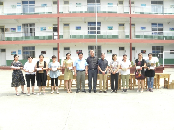 贈書儀式后與小學(xué)教師代表及鳧城鎮(zhèn)領(lǐng)導(dǎo)合影