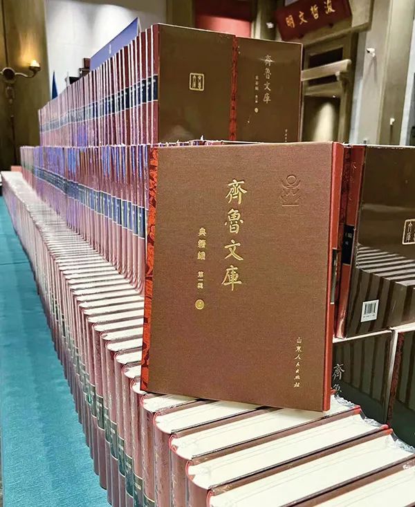 作為“山東文脈”工程的重要組成部分,《齊魯文庫》共分典籍、研究、史志、人物、文物、文學(xué)藝術(shù)、山水、科技、紅色文獻(xiàn)九編,成書規(guī)模約13億字,6000多冊(cè)。圖為2023年9月27日,《齊魯文庫》首批成果亮相。山東省委宣傳部供圖