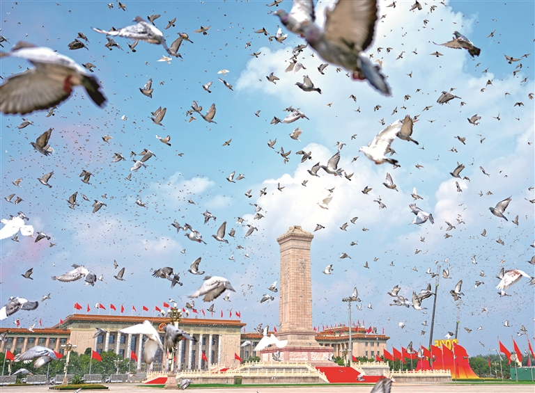 9月3日,紀(jì)念中國(guó)人民抗日戰(zhàn)爭(zhēng)暨世界反法西斯戰(zhàn)爭(zhēng)勝利80周年大會(huì)在北京隆重舉行。圖為紀(jì)念大會(huì)現(xiàn)場(chǎng)放飛鴿子。 新華社記者 牟宇 攝